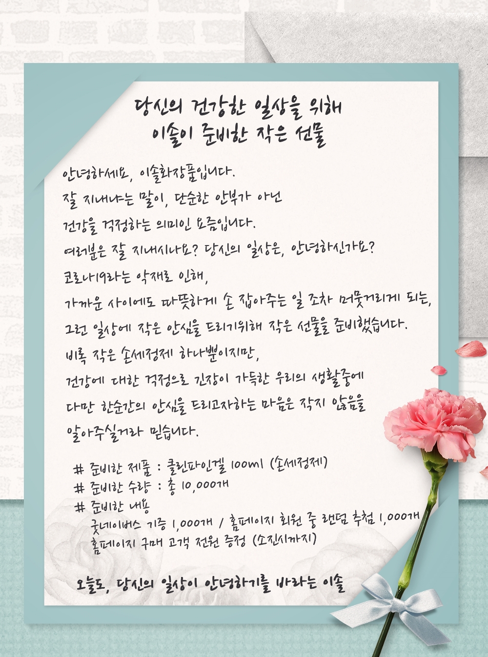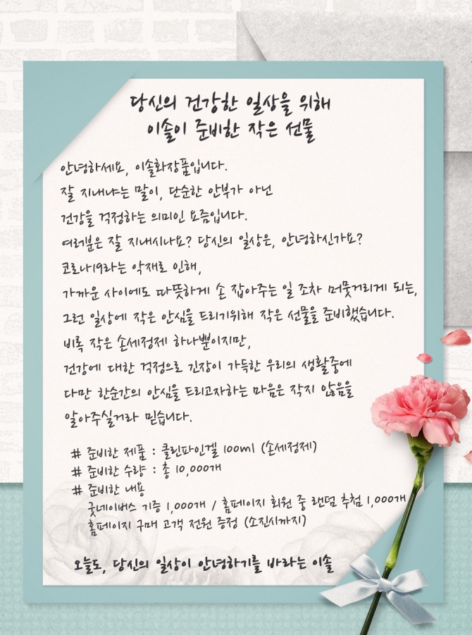 황성진 이솔화장품 대표는 “손 세정제가 품귀현상으로 구하기 어렵다는 뉴스를 보고 이런 이벤트를 진행하게 됐다”면서 “비록 많은 양은 아니지만 건강에 대한 걱정으로 긴장이 가득한 우리의 일상에서 잠시의 안심이라도 드리고 싶은 마음이다”는 울림 있는 말을 전했다.