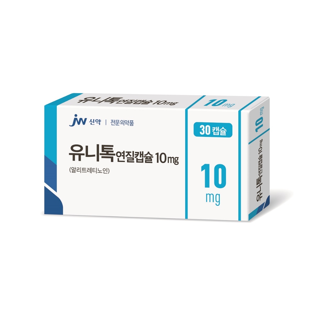 이 제품은 알리트레티노인을 주성분으로 최소 4주간의 강력한 국소 스테로이드 치료에도 반응하지 않는 성인의 재발성 만성 중증 손 습진에 사용할 수 있다. 비타민A 유도체로 염증을 억제하고 면역기능을 조절하며 1일 1회 1캡슐의 경구 투여로 간편히 복용하면 된다.
