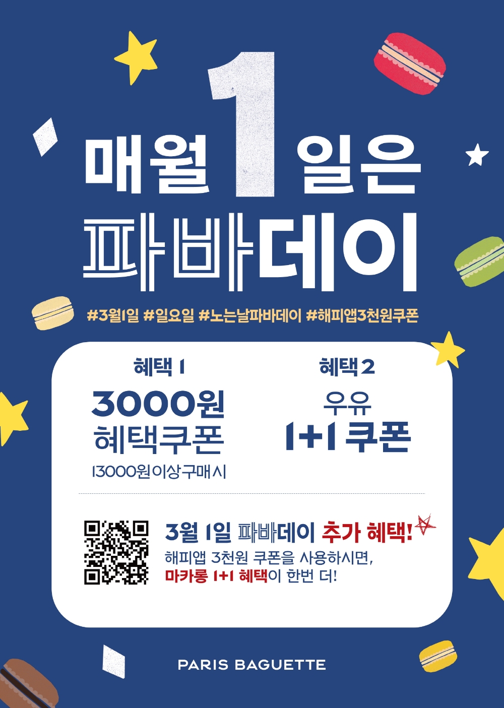 파리바게뜨 관계자는 “봄의 시작을 알리는 3월의 파바데이는 마카롱과 연계한 프로모션을 준비했다”며 “앞으로도 파바데이를 통해 소비자들이 다양한 제품을 만나볼 수 있도록 풍성한 혜택을 제공할 것이다”라고 말했다.