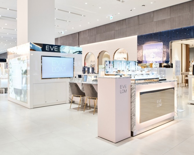새롭게 오픈하는 이브롬 매장은 매장은 이브롬 특유의 깨끗한 이미지를 전달하기 위해 환한 화이트 톤으로 꾸며졌다. 여기에 핑크와 골드 톤을 섞어 부드럽고 고급스러운 분위기를 연출했다.