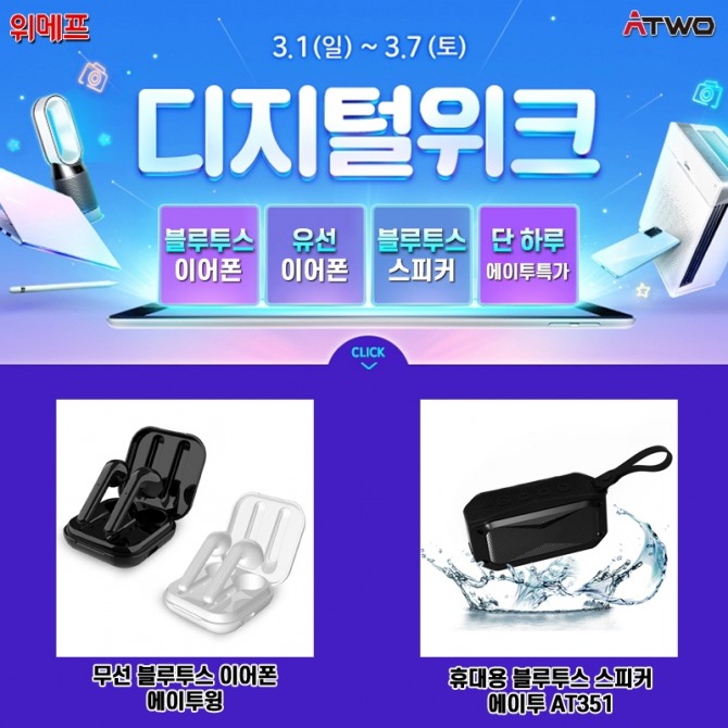 이미지 확대보기위메프 디지털위크는 오는 3월 7일까지 진행되며, 최대 60% 할인된 금액으로 판매한다. 최근 에이투 블루투스는 가성비 좋은 이어폰으로 게이밍 이어폰, 이어셋과 인테리어 소품, 홈파티용품 등으로 선물 추천 받고 있는 제품이다.