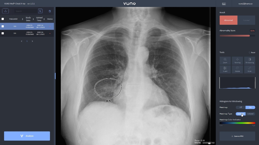 이미지 확대보기뷰노메드 체스트 엑스레이는 폐렴 진단에 도움을 주는 주요 흉부 엑스레이 소견인 '경화(consolidation)'와 '간질성음영(interstitia lopacity)' '흉막삼출(pleural effusion)' 등 총 5개의 소견을 검출하는 기능을 갖춘 흉부 엑스레이 AI 솔류션으로 식품의약품안전처 허가를 받은 제품이다.