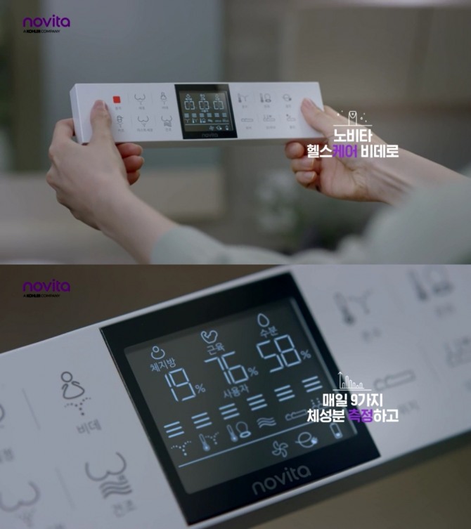 이미지 확대보기헬스케어 비데는 노비타가 업계 최초로 선보인 체성분 측정 기능을 담은 비데다. 별도의 기기 없이 비데 리모컨으로 9개 신체 지수를 확인할 수 있다. 체지방 측정을 위해 헬스클럽, 보건소 등 외부 시설을 이용해야 하는 번거로움이 없으며 모바일 앱 '마이 노비타(My Novita)'에서 측정 결과를 바탕으로 건강관리도 가능하다.