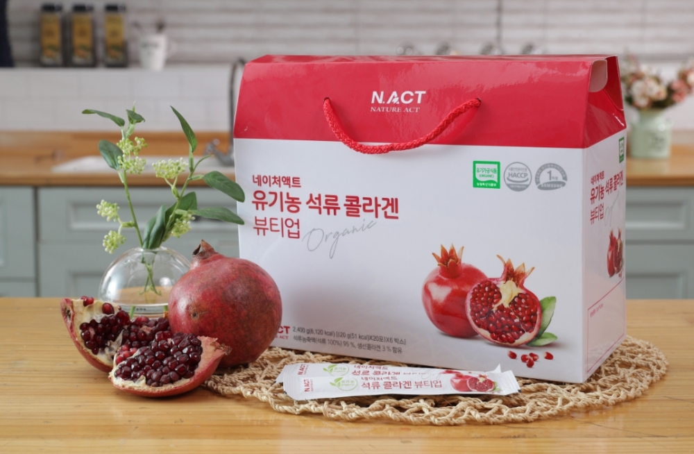 ‘네이처액트 유기농 석류 콜라겐 뷰티업’은 지중해성 기후에서 자란 터키산 유기농 석류만을 엄선해 한 포에 석류 1.2과가 들어있다. 흡수율 좋은 저분자 피쉬 콜라겐(600㎎)은 3%가 함유되었으며 높은 유기농 석류 함유량(1만9000㎎, 95%)를 자랑한다.
