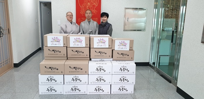 코로나19로 복지관에 나와서 함께 식사하기 힘든 노인들을 위해 집에서 간편하게 요리할 수 있는 음식 재료인 누룽지와 쌀국수를 보낸 것이다. 누룽지와 쌀국수는 월명사의 사찰음식연구소인 가미향의 상품이다.