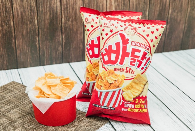 이미지 확대보기해태제과(대표 신정훈)가 2.2㎜ 얇은 두께와 바삭한 식감으로 인기 있는 새우 맛 ‘빠새’의 후속 제품으로 후라이드 치킨 맛을 구현한 ‘빠닭’을 선보였다.