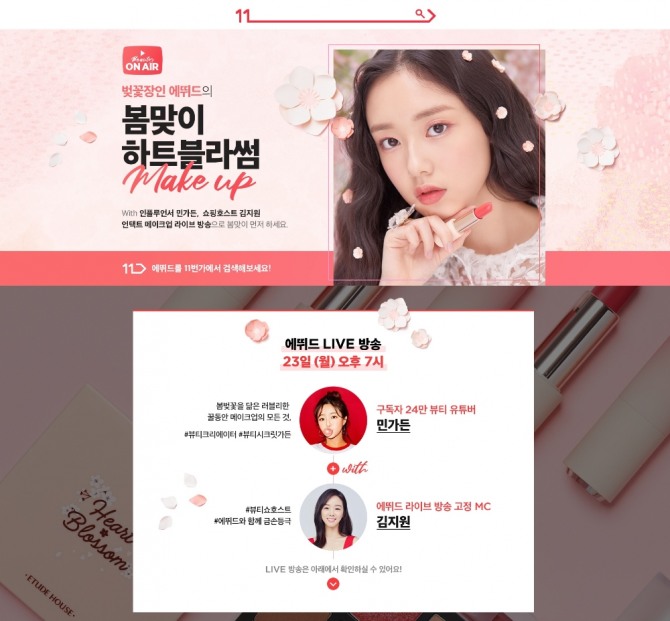 이미지 확대보기이 방송은 23일 오후 7시에 진행되며 11번가 프로모션 페이지에서 시청할 수 있다. 인기 뷰티유튜버 민가든, 쇼핑호스트 김지원이 출연해 에뛰드의 신상품 '하트블라썸' 컬렉션으로 연출하는 화사한 봄 메이크업 팁을 알려준다.