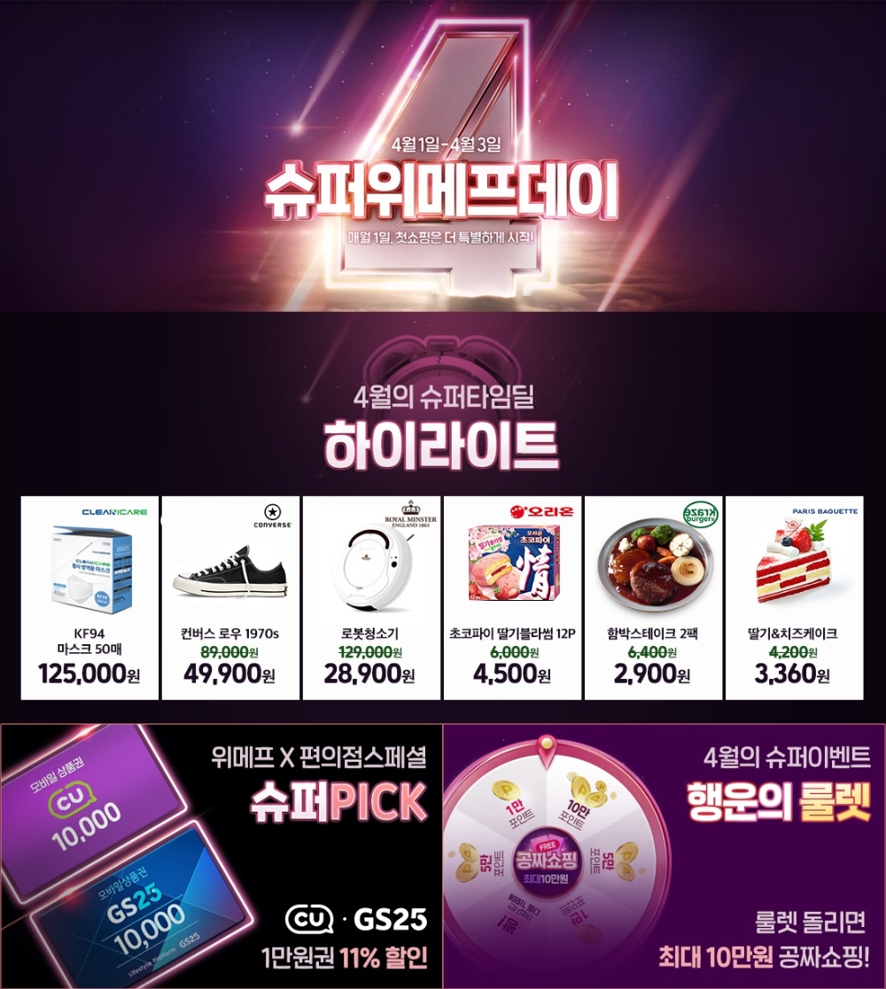 이미지 확대보기위메프는 4월 1일부터 3일 동안 ‘슈퍼위메프데이’를 열고 총 108개 초특가 타임딜 상품을 선보인다고 밝혔다. ‘슈퍼픽(PICK)’ 스페셜 추천 상품을 포함한 다양한 특가 행사도 함께 진행한다.