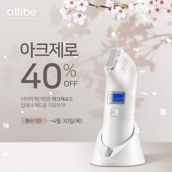 이미지 확대보기아띠베뷰티는 환절기 시즌 및 장시간 마스크 착용으로 인해 피부 트러블을 호소하는 소비자들을 위해 식약처 허가 여드름 치료 의료기기 ‘아크제로’ 할인 프로모션을 진행했다.