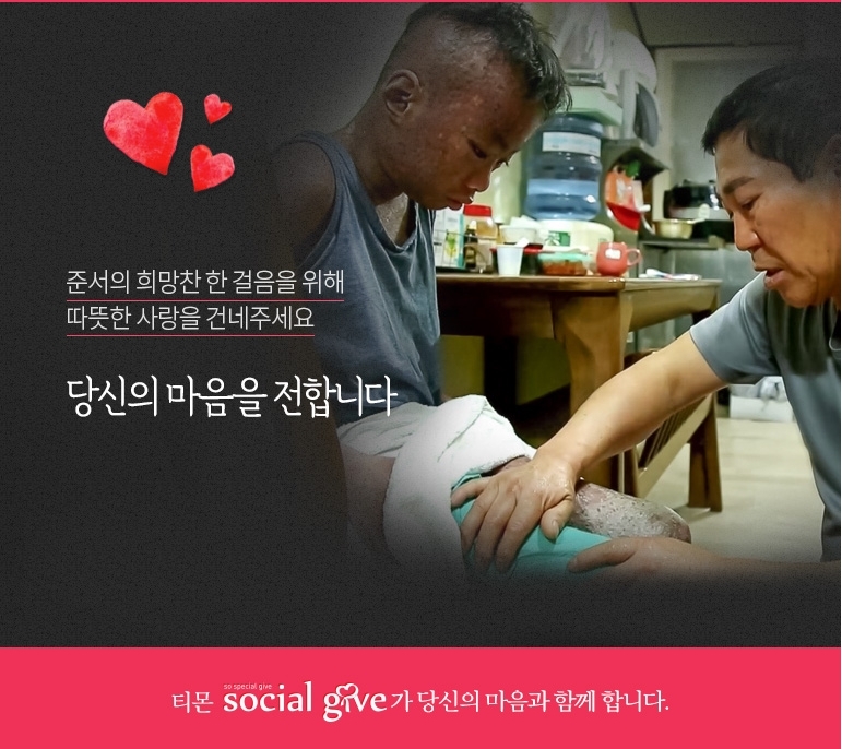 이에 티몬과 소셜기부 파트너사인 밀알복지재단은 준서가 필요한 치료와 수술을 받고 할아버지와 함께 생계를 이어나갈 수 있도록 돕기로 했다. 모금액은 다리 수술비와 치료비, 염증 완화에 필요한 의료소모품비, 긴급생계비 등으로 사용된다.
