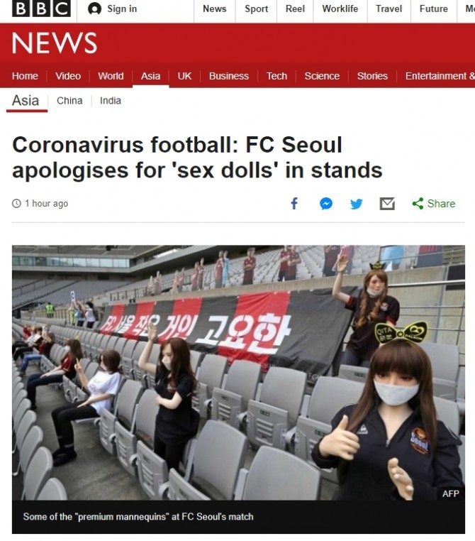 이미지 확대보기코로나19로 세계 축구팬의 시선이 한국 축구에 쏠린 가운데 FC서울의 '관중석 리얼돌(성적 목적의 전신인형) 논란'도 외신을 통해 세계로 퍼지고 있다.