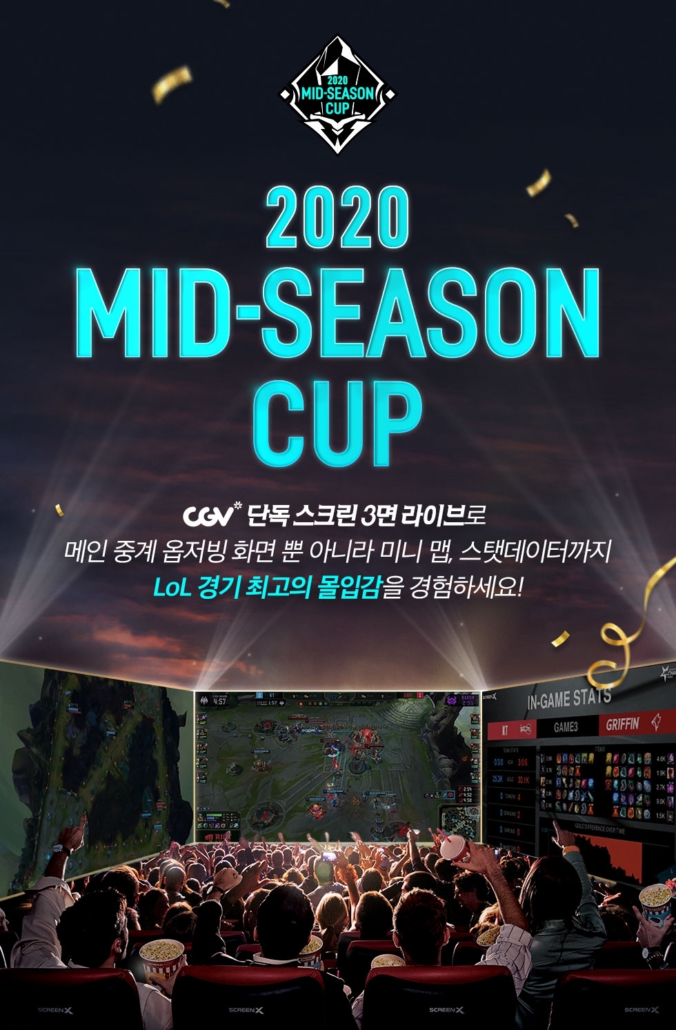 CGV는 2016년부터 ‘빅뱅 메이드’ ‘젝스키스 에이틴’ ‘트와이스랜드’ ‘러브 유어셀프 인 서울’ 등 콘텐츠를 스크린X로 선보이며 기술력을 입증했다. 상영 콘텐츠의 영역을 확대하고자 이번에는 e스포츠 ‘LoL’의 ‘2020 미드 시즌 컵’ 경기를 전국 24개 스크린X관에서 생중계한다.
