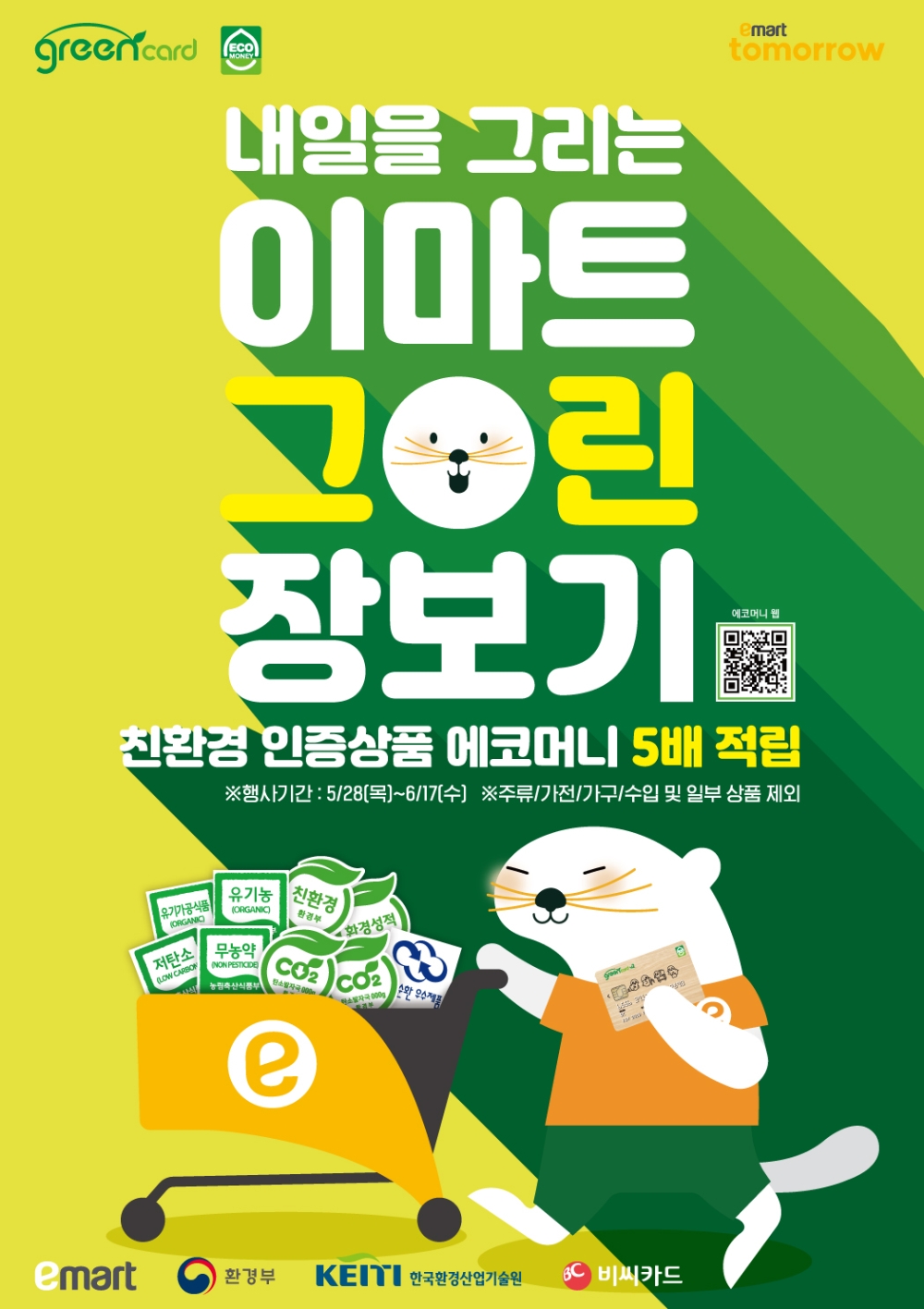 이마트는 6월 5일 환경의 날을 앞두고 고객들에게 자사의 친환경 캠페인·제품을 알리기 위해 판촉 행사를 마련했다. 친환경 인증을 받은 신선식품‧가공식품‧위생용품이 오는 28일부터 6월 17일까지 할인가에 판매된다.