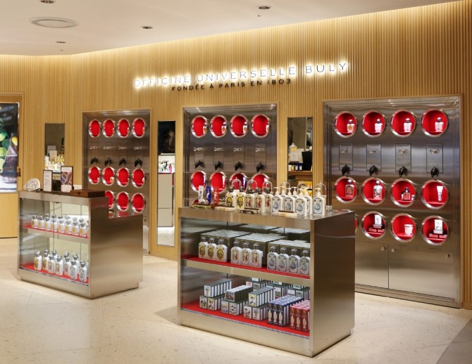 해당 매장은 내부는 고전적이면서도 고급스러운 브랜드 정체성을 느낄 수 있도록 꾸며졌다. 스틸 소재를 중심으로 사각형과 원을 조화롭게 구성해 19세기 감성을 현대적으로 재해석했다. 불필요한 디테일을 과감하게 없애고 강렬한 레드 색상 벨벳 소재를 포인트로 활용해 제품 자체에 대한 집중도를 높였다. 향수 제품 아래에는 에어 펌프가 달린 서랍을 배치해 재미있고 효과적인 시향 경험이 가능하도록 했다.