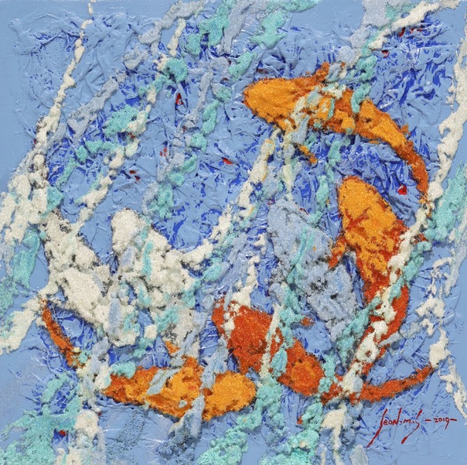 이미지 확대보기비단잉어(KOI); 잉어 그림은 행운을 불러온다고 한다. 복, 번영, 비약, 재물, 풍요, 입신출세, 의 상징이고, 부부 화애, 가정 원만, 번성, 장수, 좋은 운의 상징물이다. 잉어 그림은 생에 대한 기쁨과 감사로 가득하다. 작품을 통해 사람들에게 행복하고 따뜻한 에너지를 전달하고 싶은 작가의 소망처럼 작품 속 대상들은 언제나 밝고 경쾌한 색과 기운을 발산하면서 역동적인 힘을 전달한다. 작품은 채도를 낮추고 명도를 높이는 방법으로 자연색을 따른다. 명도가 높은 색채를 통해 대상에 활력과 생기를 불어넣는 작업이다.