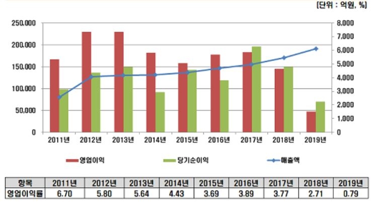 이미지 확대보기이마트는 지난해 2분기 창립 후 처음으로 분기 적자(매출액 4조 5810억 원, 영업이익 –299억 원, 당기순이익 –299억 원)를 냈다. 이런 영향으로 2019년 총 매출은 2018년보다 11.8% 증가한 19조 629억 원, 영업이익은 2018년 대비 67.4% 감소한 1507억 원으로 나타났다. 2015년 이후 3%대를 꾸준히 유지하던 영업이익률은 0.8%로 떨어졌다. 지난해 12월 한국기업평가의 분석 결과 이마트는 신용등급 AA+, 등급 전망 ‘부정적’으로 평가되는 수모를 당해야 했다.