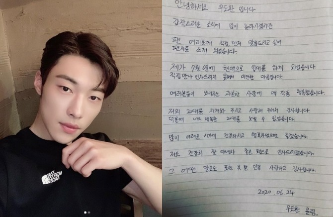 이미지 확대보기우도환은 24일 밤 자신의 인스타그램에 자필편지를 게재해 "갑작스러운 소식에 많이 놀라시겠지만, 팬 여러분께 직접 먼저 말씀드리고 싶어 편지를 쓰게 됐다"고 말문을 열었다.