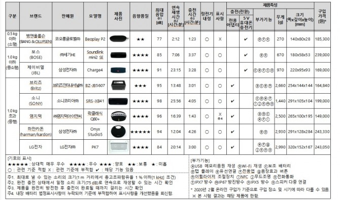 25일 소비자원에 따르면 선호도가 높은 블루투스 스피커(배터리 내장형) 8개 제품을 대상으로 음향품질, 최대음압, 연속 재생시간, 충전시간, 무게 등을 평가했다.