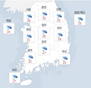 이미지 확대보기비는 아침에 제주도에서 시작돼 오후부터 남부지방과 충청도, 밤에는 서울·경기 남부와 강원 남부에 내리겠다.