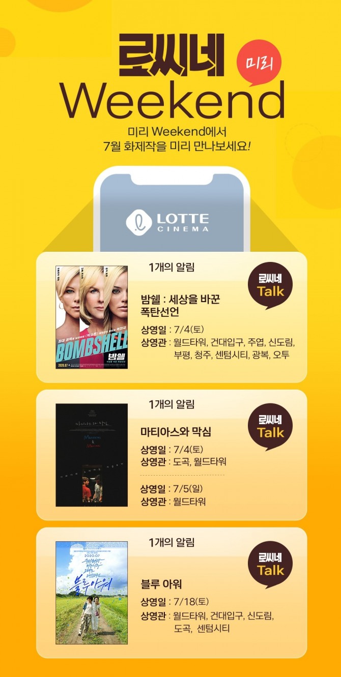 로씨네 미리 Weekend는 뛰어난 작품성의 해외 독립·예술 영화를 개봉 전 선보이는 행사다. 상영작은 이달 8일 개봉 예정인 ‘밤쉘: 세상을 바꾼 폭탄선언’, 22일 개봉 예정인 ‘블루 아워’, 23일 개봉 예정인 ‘마티아스와 막심’ 등 총 3편이다.