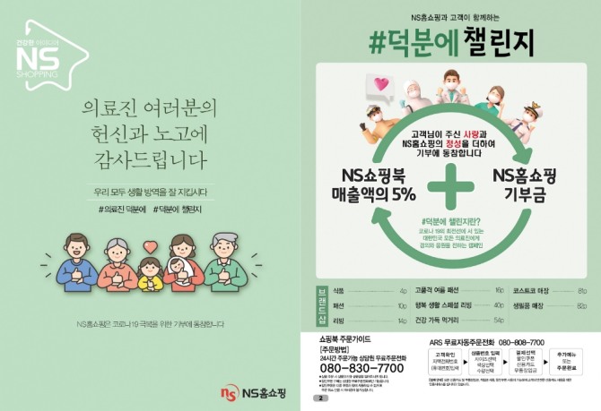 NS쇼핑북의 VIP북은 정기발행 부수 65만 부로 카탈로그 업계 1위인 NS쇼핑북의 고객 중 우수고객을 대상으로 배포되며 약 13만 부가 발행된다. 상품 소개·광고로 인기가 높은 표지와 첫 페이지를 할애해 코로나19 극복을 위해 헌신하는 의료진에게 감사의 마음을 전하는 덕분에 챌린지에 동참하기로 했다. 고객과 NS홈쇼핑이 함께 하는 '1+1 기부'도 진행할 예정이다.