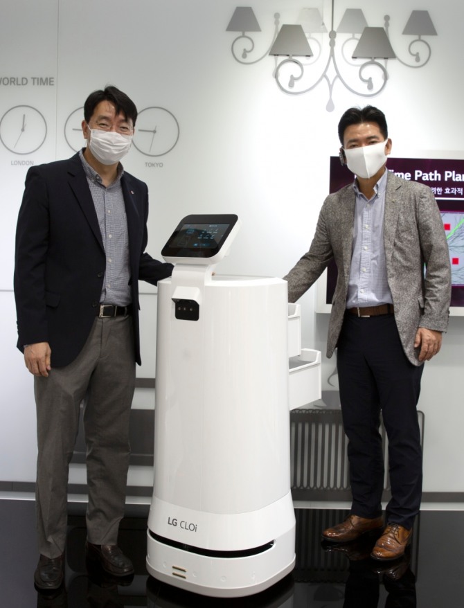 자율주행 로봇(사진)이 편의점 상품을 배송하는 서비스가 올해 안에 도입된다. 사진은 김성기 GS리테일 상무와 정원진 LG전자 상무. 사진=GS리테일