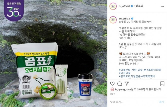 이 회사에 따르면 이번 행사에 힘입어 7월 대비 이달(1~18일) 호랑이라테 매출은 19.5%, 곰표 오리지널팝콘 매출은 17.8% 신장했다. 긴 장마로 아이스크림 매출이 주춤한 가운데서도 쑥떡쑥떡 바 매출은 7월 대비 10.4% 올랐다. 편의점 주력 상품이 아닌 다진마늘도 지난달 대비 매출이 45.3% 뛰었다. 행사 결제 수단인 BC페이북의 8월 1~18일 이용 건수도 7월 같은 기간 대비 28.6% 상승했다.