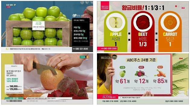 주요 홈쇼핑사에서 판매한 '리타 ABC 주스' 방송 장면. 사진=방송통신심의위원회