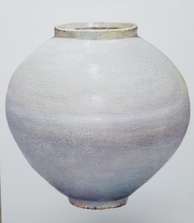 이미지 확대보기‘달항아리’는 정제된 색상, 굴절된 묘사도 잘 어우러진다. 시간의 흔적이거나 환각을 보이게 하며 미래의 모습을 바라보는 투시경과도 같다. 작가는 도자기의 표면에서 드러난 담백하고 담담하며 현실에 긍정하는 순수한 마음, 소박한 서민들의 일상 속에서 드러난 감성을 좋아한다. 2000년대에 발표한 <숨결시리즈>와 <Time & Space> 시리즈는 전통적인 구상회화의 범주를 벗어나 ‘도기’와 ‘다기’의 일루전을 화면의 주제로 활용하되, 우리 민족의 ‘얼과 숨결’이 살아나도록 하는 표현방식을 사용하고 있었다. 전통적인 항아리, 민속품 등이 실루엣으로 표현되며 잔잔한 바다나 안개 낀 도시풍경 등이 배경이 되기도 한 <Intimate but Odd, 익숙하지만 낯선> 시리즈는 예술성과 사회성을 동시에 소지한 작업이었다.