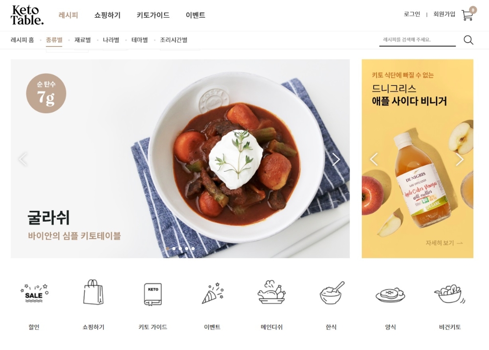 20여 개 브랜드가 입점해 있는 이 플랫폼은 키토제닉 종합 포털로서 유명 요리 연구가의 키토제닉 식단 레시피를 ‘종류’, ‘재료’ ‘나라’ ‘테마’ 등 여러 주제별로 선별해 제공한다. 각 메뉴 안에는 ▲조리 방법 ▲소요 시간 ▲영양성분 비중 ▲난이도를 표기했고, 하단에는 관련 상품을 덧붙여 필요한 식자재를 한 번에 구매할 수 있도록 구성했다.