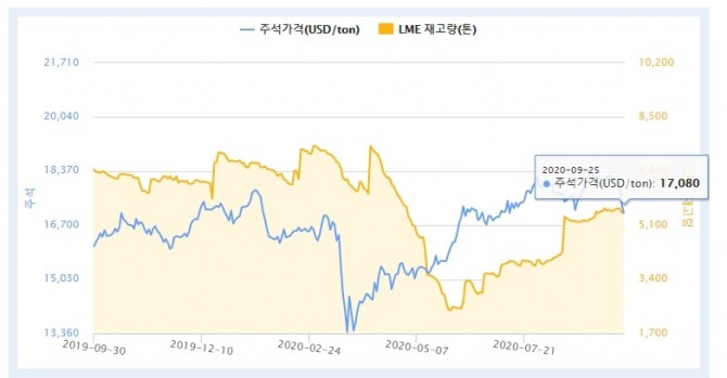 주석가격은 신종코로나바이러스감염증(코로나19)에 따른 수요 급감으로 3월19일 t당 1만3400달러로 최저가를 기록했다. 이후 등락을 거듭하면서도 오름세를 보였다. 특히 지난 7월 세계 반도체 판매량이 전년동기대비 4.9% 증가하는 등 전자제품 산업이 회복함에 따라 지난 23일에는 t당 1만8055 달러로 급상승하기도 했다.