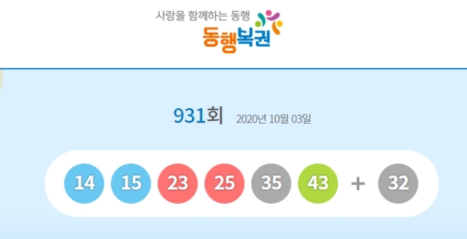 3일 진행된 제931회 동행복권 로또 추첨 결과 당첨번호가 14·15·23·25·35·43으로 결정됐다. 2등 보너스 번호는 32이다.