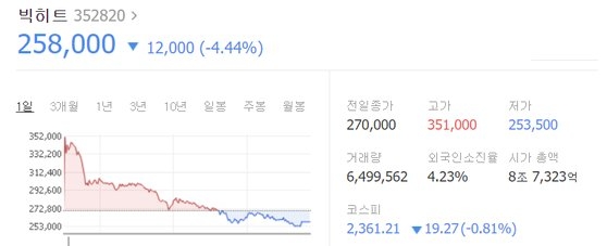 이미지 확대보기이날 빅히트의 주가는 공모가(13만 5000원)를 160% 웃도는 27만 원으로 출발해 1시간이 지나기도 전에 상한가(35만 1000원)에 도달했지만 이후 계속 하락세를 보이면서 결국 시초가보다 4.44%가 내려간 가격으로 마감했다.