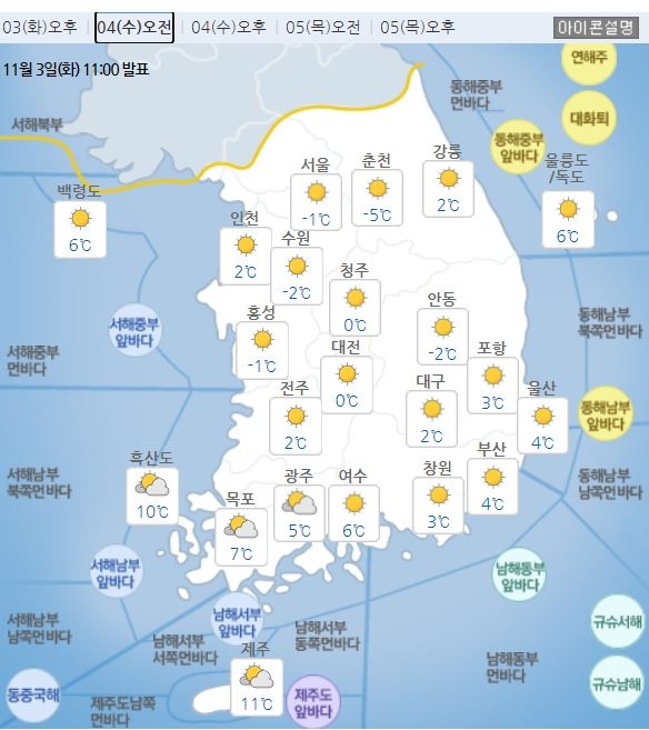 이미지 확대보기내륙 대부분 지역에서 0도 이하로 떨어지며, 중부내륙과 전북동부, 경북내륙 영하 5도 내외로 낮아 매우 춥다.