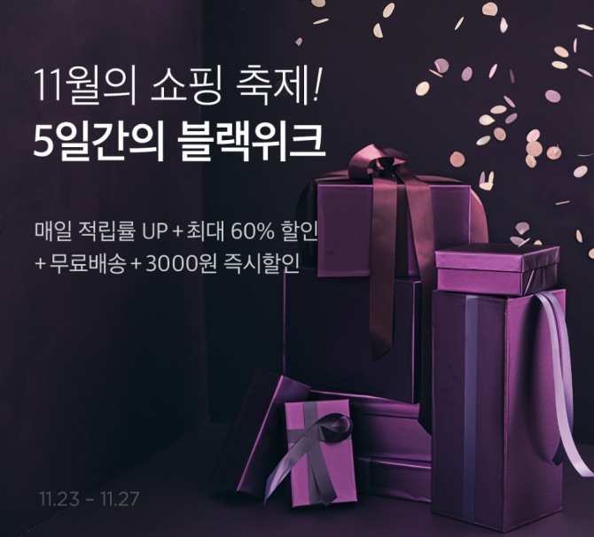 이미지 확대보기블랙위크는 마켓컬리가 블랙프라이데이 시즌을 맞아 준비한 11월의 쇼핑 축제다. 적립금, 상품 할인, 무료배송, 기획전 추가 쿠폰, 결제 이벤트 등 혜택을 제공한다.