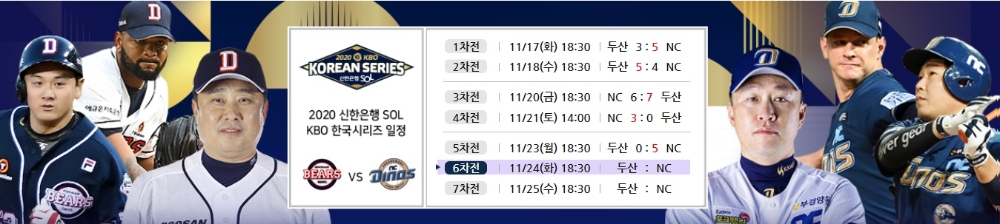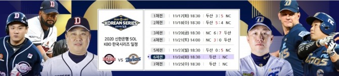 지난 17일부터 치러진 '2020 프로야구 한국시리즈'는 23일 5차전 경기에서 NC가 두산을 3:2로 앞서고 있어 우승까지 1승만 남겨두고 있다. 이날 고척구장에서 치러지는 6차전 경기에서 두산 선발투수 알칸타라 선수와 NC 선발투수 루친스키 선수가 맞붙는다.