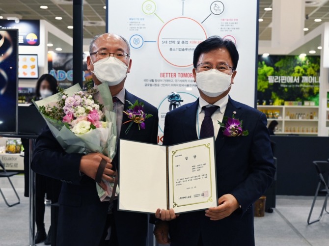 식품기술대상에서 'NS홈쇼핑 대표이사상을 수상한 김남엽 ㈜명인수산 대표(왼쪽)와 조항목 NS홈쇼핑 대표이사가 기념사진을 촬영하고 있다. 사진=NS홈쇼핑