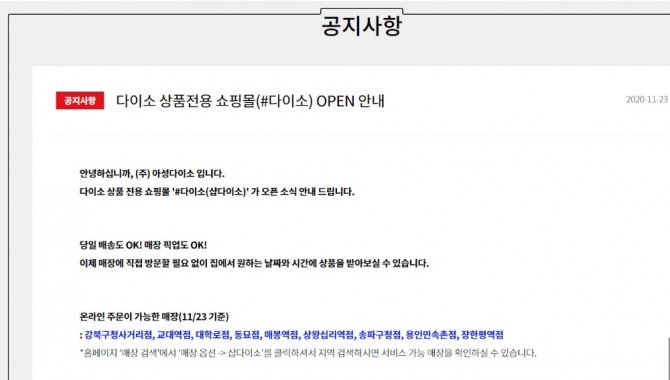 1일 관련 업계에 따르면 다이소는 지난달 23일 홈페이지에 샵다이소 오픈 소식을 공지했다.