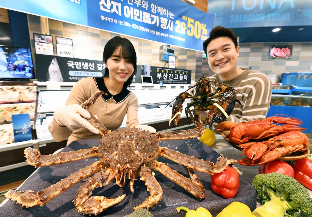 ‘점보 랍스터’와 ‘점보 킹크랩’은 삼성카드 결제 고객 대상으로 20% 싸게 판다. ‘활 랍스터 세트’와 ‘자숙 랍스터 세트’ ‘크레이피쉬’ ‘흰다리새우’도 기존가 대비 저렴하게 살 수 있으며, 냉동 새우 13종은 마이홈플러스 회원 대상으로 30% 할인된다.