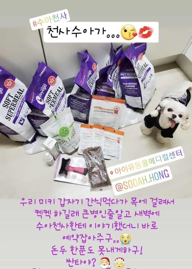 이미지 확대보기6일 홍수아 지인은 인스타그램에 #수아천사라는 사진과 함께 "우리 미키가 갑자기 간식 먹다가 목에 걸려서 힘들어하길래 큰 병인줄 알고 새벽에 수아와 통화를 했다"며 "수아가 이를 듣고 병원 예약부터 결제까지 미리 해버렸다"라는 글을 게재했다. 사진=인스타그램