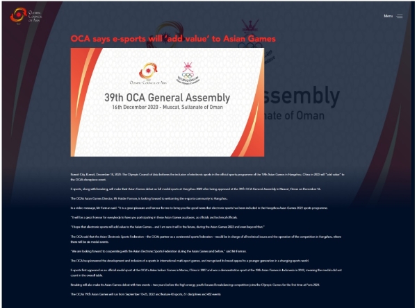 이미지 확대보기아시아올림픽평의회(Olympic Council of Asia, OCA)는 e스포츠가 정식종목(as full medal sports)으로 선정됐다며 2022 항저우 아시안게임에 가치를 더하게 될 것이라고 18일(한국시간) 발표했다.