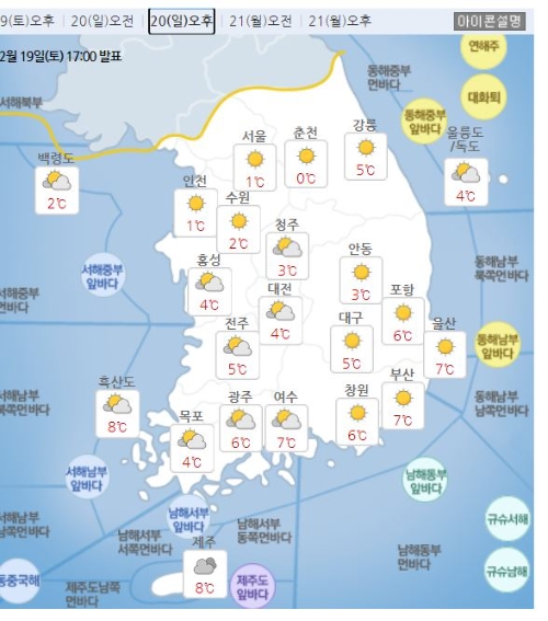 20일 아침 최저기온은 -16~0도, 낮 최고기온은 –1~7도이며, 21일 아침 최저기온은 -15~0도, 낮 최고기온은 1~9도가 되겠다.