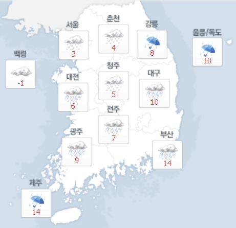29일의 경우 중부지방은 낮 12시부터, 남부지방은 오후 3시부터 비 또는 눈이 오다가 30일 0시에 대부분 그치겠다. 제주도는 29일 낮 12시부터 비 또는 눈이 오는 곳이 있겠다. 서울·경기도와 강원 영서에는 오전 6시부터 낮 12시 사이 산발적으로 눈이 날리거나 빗방울이 떨어지는 곳이 있을 전망이다.