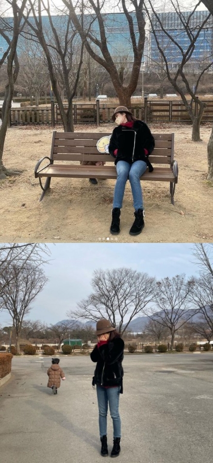 사진 속 채림은 야외에서 눈을 꼭 가리고 아들과 숨바꼭질을 하고 있다.
