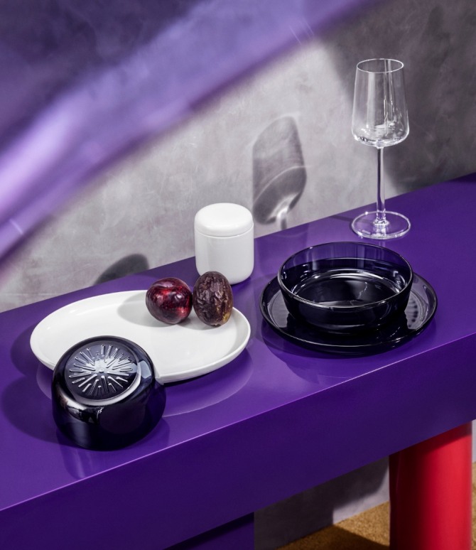 깊은 진회색 유리 소재로 된 접시와 볼(오목한 그릇) 3종은 하단을 장식한 빔 패턴이 특징이다. 간결한 선과 완벽한 균형감이 상품에 절제된 느낌과 개성을 불어넣는다.