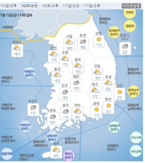 저기압이 동쪽으로 이동한 후 찬 대륙고기압이 우리나라로 확장하면서 기온이 낮아져 16일 아침최저기온은 오늘보다 큰 폭(10도 내외)으로 떨어지겠다.