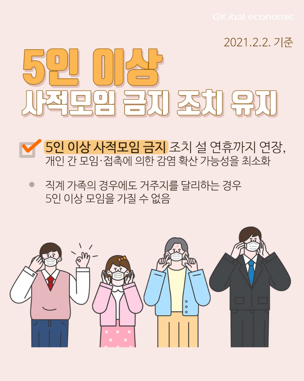5인 이상 사적모임 금지 조치를 설 연휴까지 연장하여 개인 간 모임 접촉에 의한 감염 확산 가능성을 최소화합니다. 직계 가족의 경우에도 거주지를 달리하는 경우 5인 이상 모임을 가질 수 없습니다.