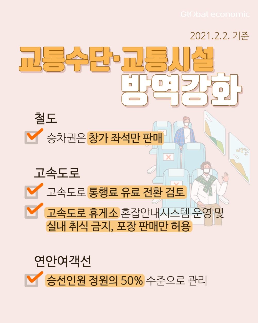 - 철도 : 승차권 창가 좌석만 판매