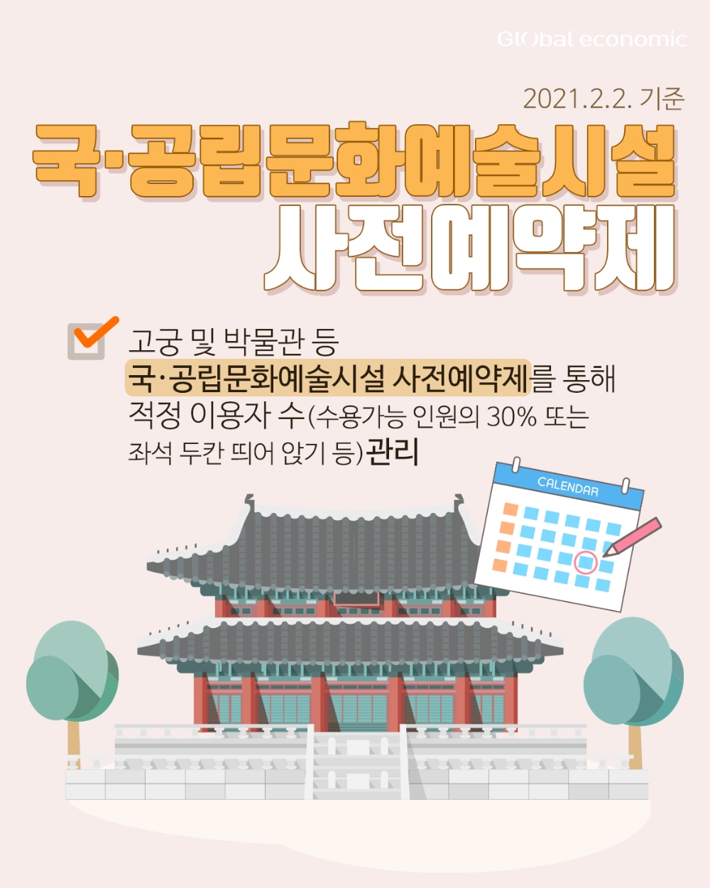 고궁 및 박물관 등 국·공립문화예술시설 사전예약제를 통해 적정 이용자 수(수용가능 인원의 30% 또는 좌석 두 칸 띄어 앉기 등) 관리