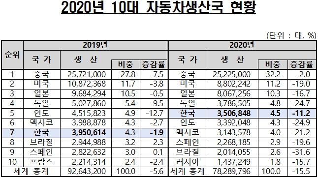 한국은 주요 10대 생산국 가운데 중국(2523만 대), 미국(880만 대), 일본(807만 대), 독일(379만 대)에 이어 다섯 번째로 나타났다. 이는 2019년 7위보다 두 계단 뛰어오른 것이다.